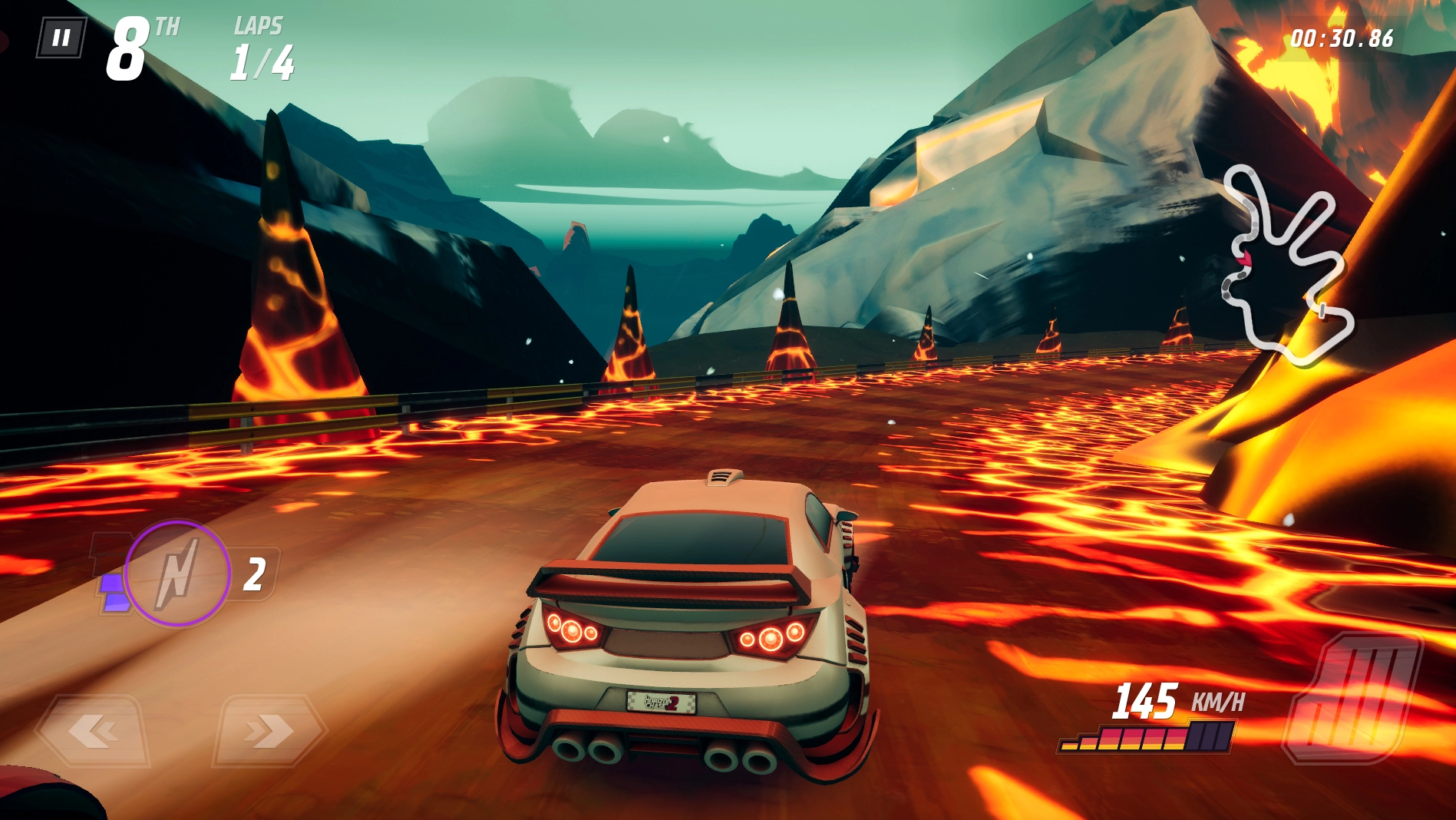 Because of that, the internal progression of Japan ended up actually as a good way to represent the whole Horizon Chase 2 progression. It starts on nice and calm flower fields, with old temples and the ancient culture of this country is represented. It goes downtown, showing Akihabara and the futuristic Japan we all know from Japanese culture. And it ends by showing nature's contrast between snow and lava. Long story short: it has local culture, big cities, and natural adversities - important pillars of our level design in all our countries.