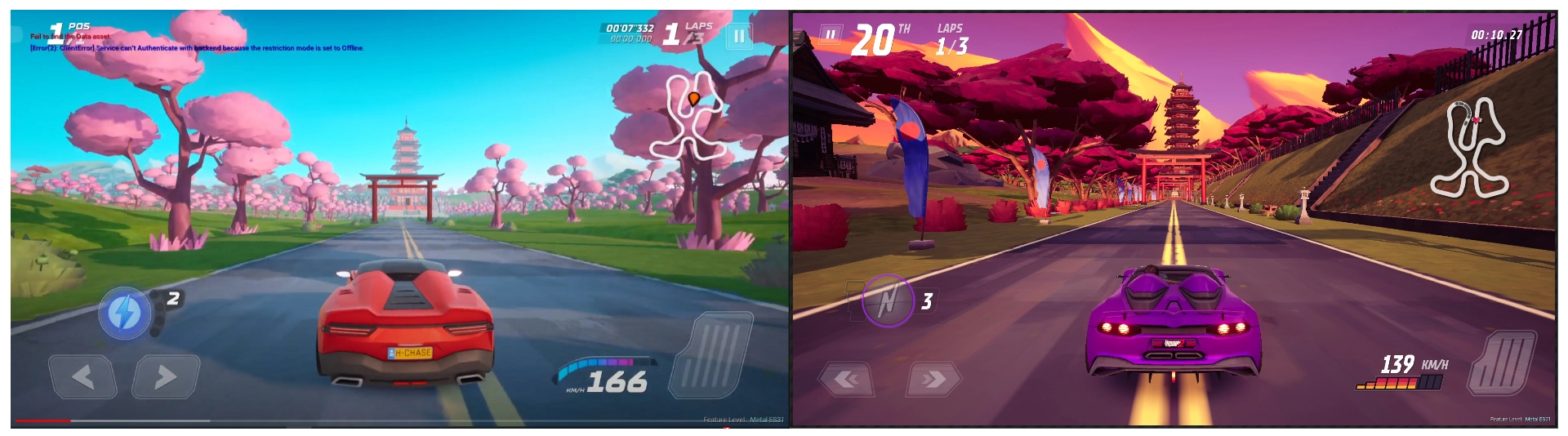 In Horizon Chase 2, we use camera angles and verticality to add or remove challenges in the track. For instance, you can see during Hitachi that there will be some Blue Coins to be collected in the middle of the flower field, even if it’s not exactly clear how the track will be shown to you. That small downhill glimpse of your next path helps the player to understand what’s important about that stage and drives them in the right direction when the moment comes.